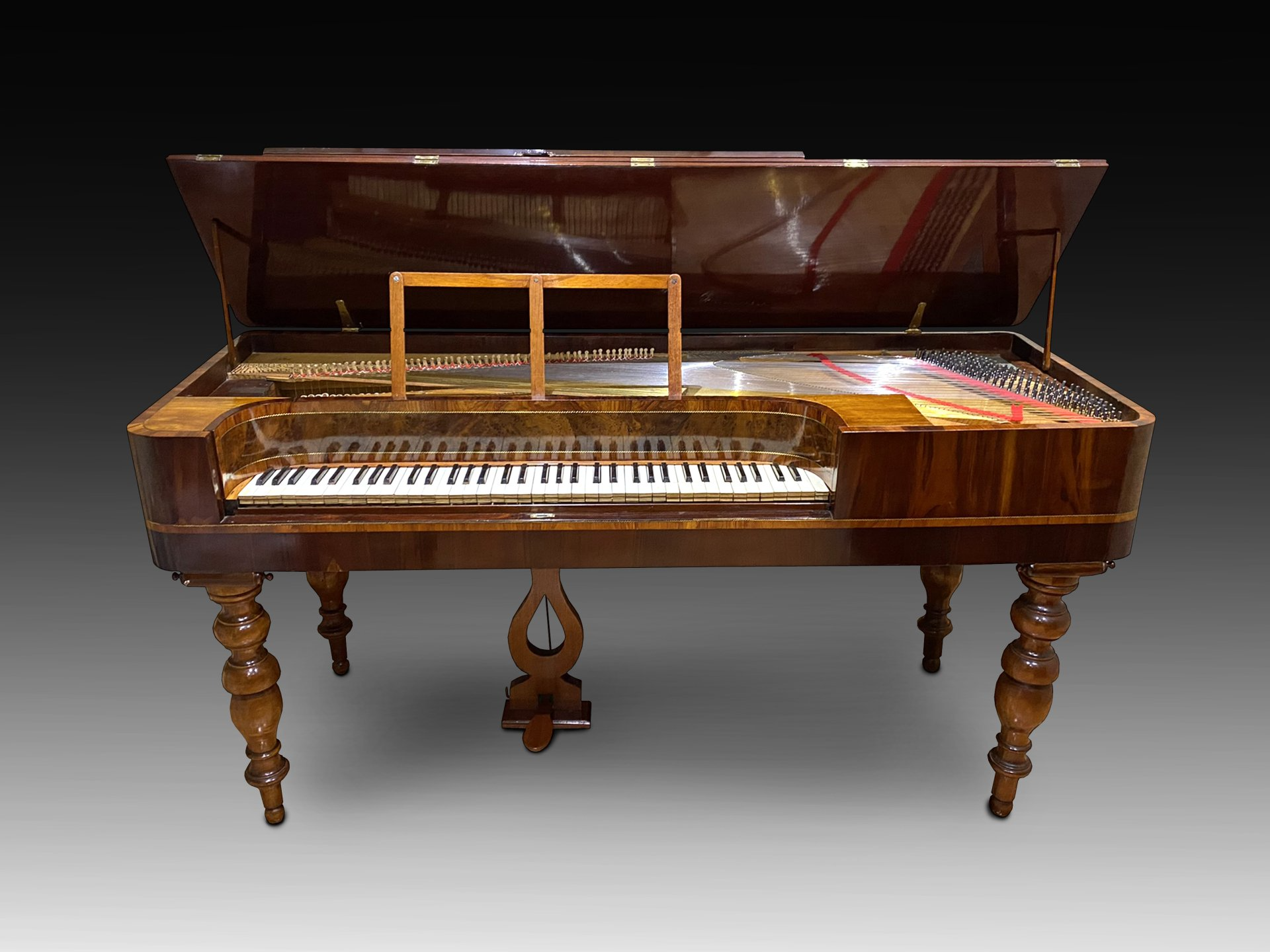 Estamos ante un espléndido pianoforte de mesa de delicada factura y sonido armonioso construido hacia 1825 por la firma Hosseschrueders. Un mueble fernandino con acabados en madera de raíz y palma de caoba con decoración a base de latón trenzado, de seis octavas, que presenta una delicada mecánica de acción doble inglesa, con un sobresaliente sonido en la parte central del teclado. Posee un solo pedal de resonancia en forma de lira. Este instrumento forma parte de la colección particular de D. Antonio Santos García. Fue recuperado como instrumento en el año 2019, entrando a formar parte del grupo de música antigua Hispana Lyrica. Este ensamble, con sede en Salamanca, se dedica a la investigación, recuperación e interpretación con criterio histórico del género canción española de los S.XVIII y XIX. Está integrado por María del Monte (soprano), Antonio Santos (barítono), Rebeca Gea (guitarra romántica) y Manuel Calvo (pianoforte). Emplean tanto instrumentos como ediciones musicales originales en su empeño por mostrar al público del S. XXI la sonoridad de época fiel a la realidad del S. XIX. Con este pianoforte se han presentado en concierto en varias localidades de Castilla y León y han realizado diferentes grabaciones, siendo su instrumento de tecla principal. En el año 2021 el instrumento ha sido sometido a un delicado trabajo de restauración por parte de Víctor J. Martínez para devolverlo a su aspecto original, utilizando las mismas técnicas y materiales empleados en su origen para aproximarnos al máximo al sonido histórico original. Podéis contemplarlo y escucharlo en el siguiente vídeo.