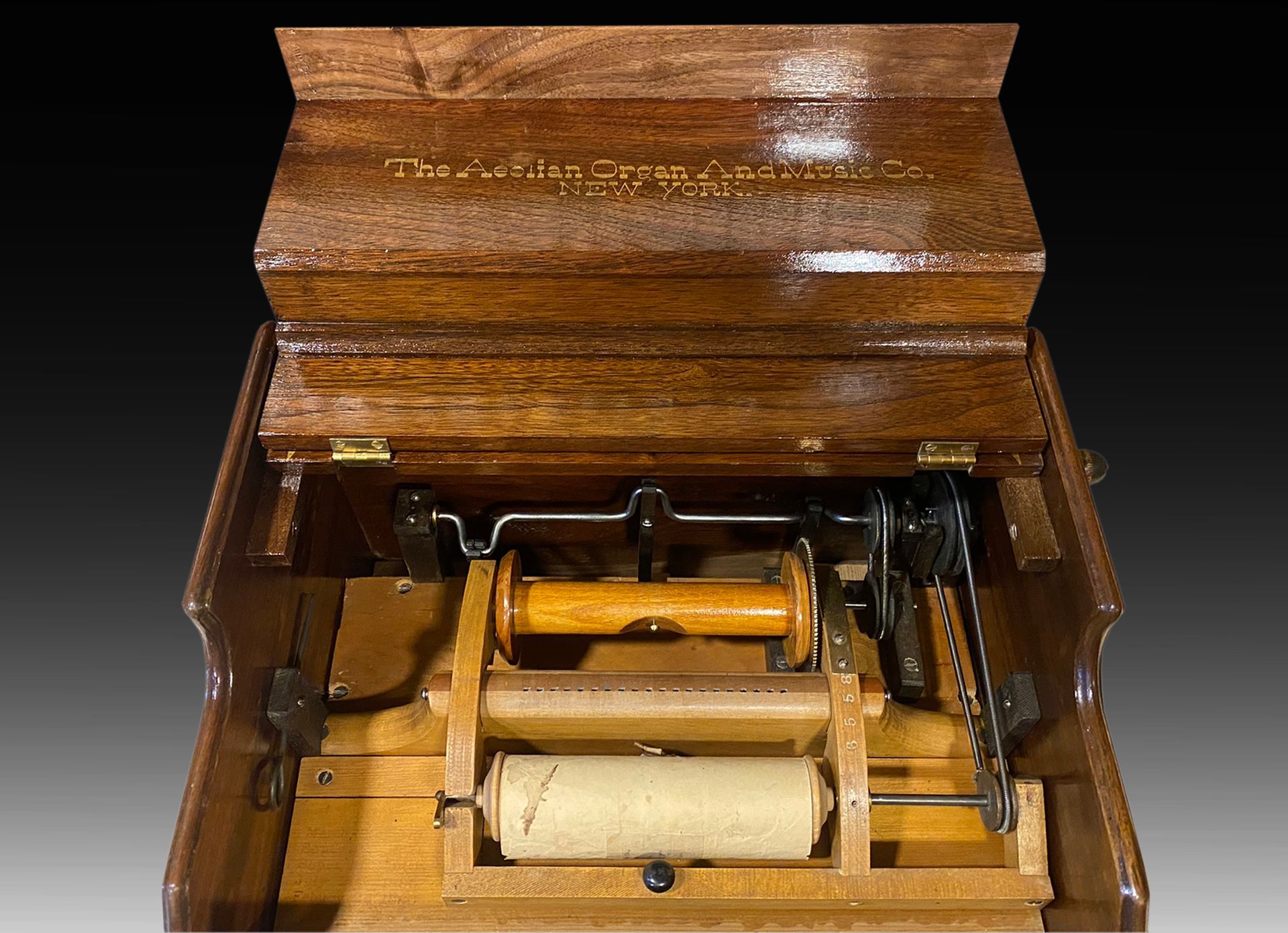 Restauración de una CELESTINA, pianola de succión mecánica con rollos d e papel perforado. Restauración de una CELESTINA por Víctor J. Martínez. Se trata de una pianola de succión de aire accionada por tres fuelles y un secreto de succión. En su interior se atesoran las válvulas con pequeños fuelles que al acrecentar abren el paso de aire de cada una de las viente notas musicales que contiene,que consiguen su sonido gracias a lengüetas de bronce similares a las de un harmonium. El funcionamiento se basa en el paso de un rollo de papel perforado por los orificios de entrada de aire, dejando circular el aire al paso por los orificios mencionados. Por un lado, al abrir sus tapas abatibles vemos la compañía The Aeolian Organ and Music Co. New York sobre la tapa superior y Mechanical Orguinetto Co. New York sobre la tapa frontal. estas señas nos sitúan en el último tercio del siglo XIX en la gran metrópolis de New York, donde estas inventivas proliferan con gran auge y buena recepción de la población. Serán importados a toda Europa, como un objeto musical suntuoso e ilustrado, con gran aceptación de las clases sociales acomodadas.